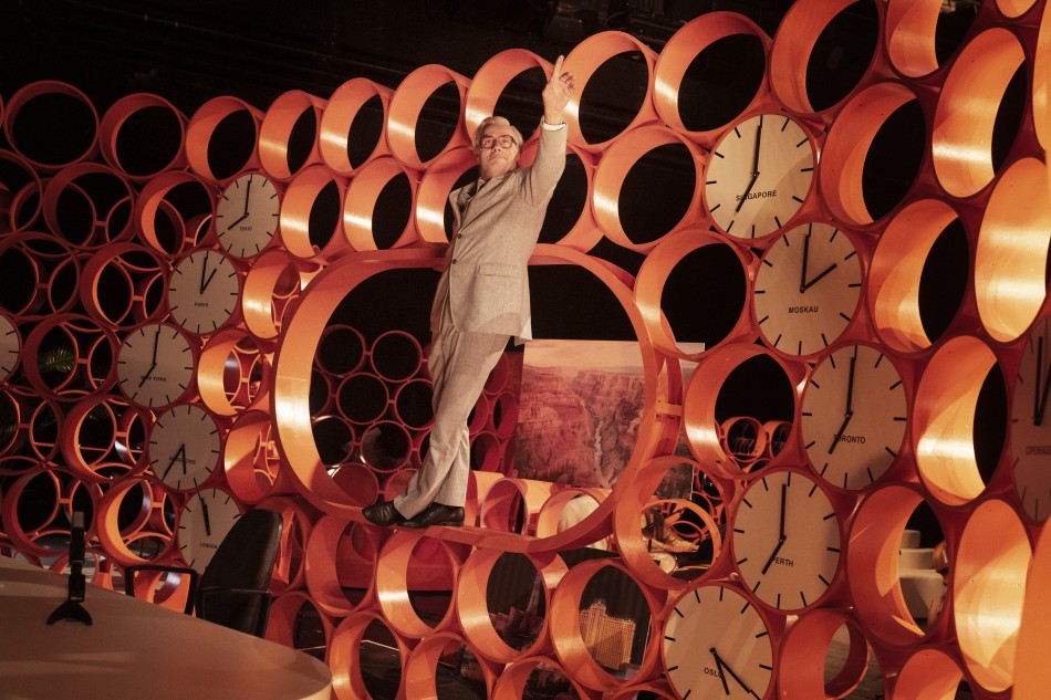 Beales Nachrichtenstudio ist ganz dem Geist der Zeit entsprechend gebaut. Das schlichte aber große, weiße Pult steht vor einer Wand aus leuchtend orangenen Kreisen, in die mehrere Uhren mit den anderen Zeiten großer Städte weltweit eingebaut sind.