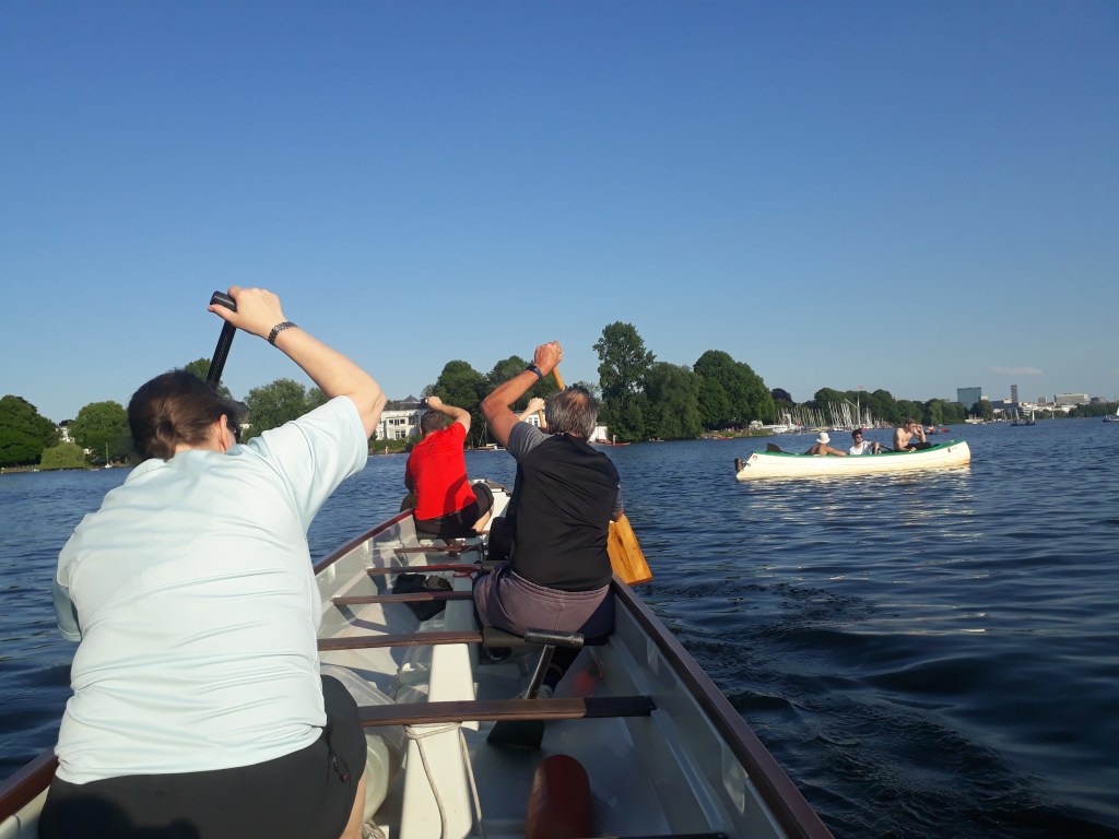 Trotz der sommerlichen Temperaturen wirkt die Luft auf der Alster fast kühl, was sehr angenehm ist. Denn während der Paddelstrecke von acht Kilometern bin ich ordentlich ins Schwitzen geraten. Als wir am Isekai 12 ankommen, soll ich den sogenannten Fender des Drachenbootes auswerfen. Er hat ein wenig die Form und Farbe einer Leberwurst in Verpackung und verhindert, dass das Boot gegen den Steg knallt und beschädigt wird. Unser Steuermann ruft: „Abstoppen!“, und ich bin kurz verwirrt, wer nun was tun soll. Jenny Skraem, die mich während der Tour unter ihre Fittiche genommen hatte, erklärt es mir. Dann stoppen Jens Heuser, der Schlagmann, und ich ab, bremsen also das Boot, sodass wir parallel zum Steg liegen. Alle klopfen als Dank für die Fahrt mit den Paddeln gegen das Boot, dann wird von vorne nach hinten ausgestiegen. Ich bin die Letzte, die aussteigt und kann dadurch noch etwas Atem schöpfen. Jenny erklärt mir: „Eigentlich hilft man sich aus dem Boot, bei Corona geht das nicht“.