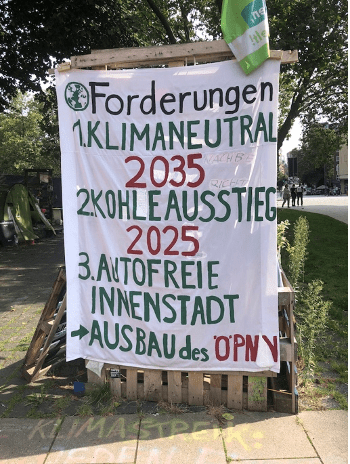 Größtenteils sei das Feedback von außen allerdings positiv, so Maia und Nils. Bei schönem Wetter kämen pro Stunde manchmal fünf bis zehn Leute vorbei, um sich mit den Jugendlichen auszutauschen. Gesprächseinstieg biete dabei meist der Forderungsbanner im Eingang des Camps, berichtet Nils. Bleiben Leute interessiert daran stehen, sprechen die Aktivist:innen sie an und beantworten Fragen.