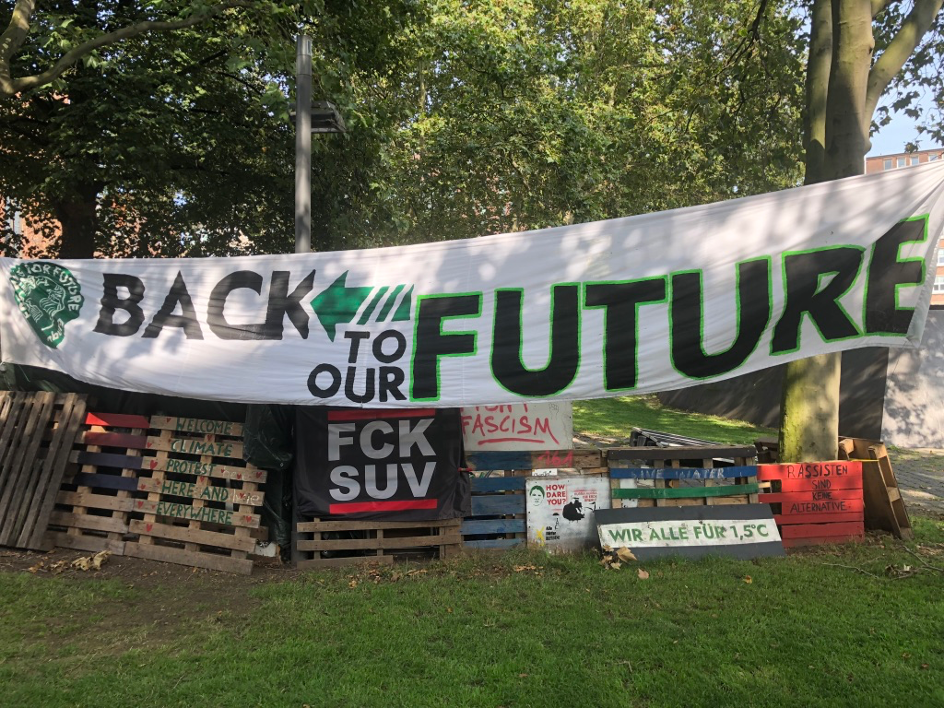 Exakt 70 m² misst das Hamburger Klimacamp der „Fridays for Future“-Bewegung. Zahlreiche Stoffbanner und bemalte Paletten zieren den Außenbereich: „Time is up“, „Wir alle für 1,5 Grad“ und „FCK SUV“ – so lauten einige der Botschaften. Alles ist genau abgezählt und angemeldet: die Sitzgelegenheiten (5), der Tisch (max. 1 x 1 m), die Seitenwände des Pavillons (nur 2) und sogar die Anzahl der vielen Getränkekisten. Wer sind die jungen Menschen, die sich hier eingerichtet haben und wie geht es ihnen nach einem Jahr?