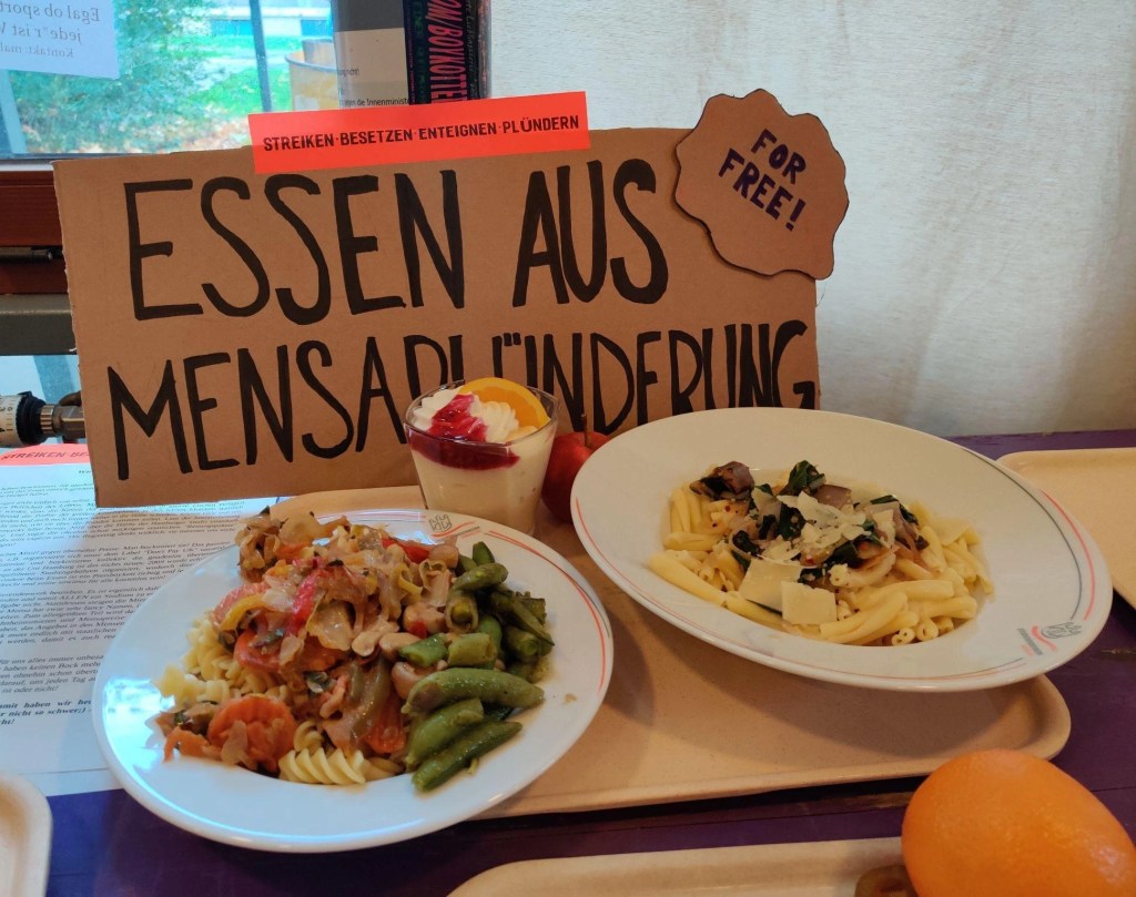 So for now, we think it’s okay for hungry people to help themselves by looting. The fact that legitimate protest is allowed to cross legal boundaries becomes obvious in the example of civil disobedience. Fundamental democratic institutions like universal suffrage would not exist without political transgressions. And even if the looting is primarily about collective self-help, there are political demands: Food in the dining halls should be free for all and the student union should be reasonably equipped for this – its underfunding is no secret. And it affects students and employees alike.