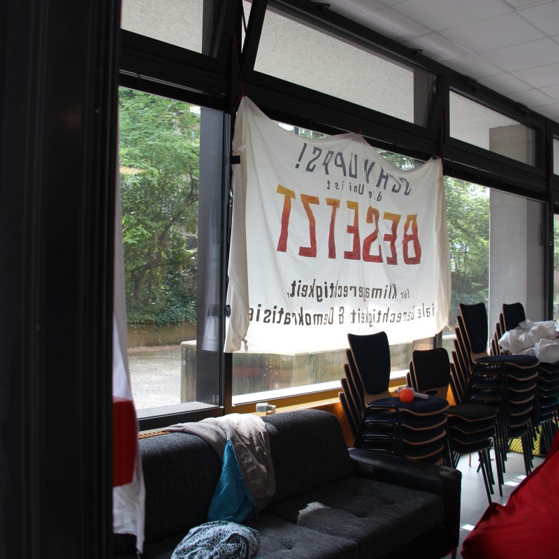 Der besetzte Raum im WiWi-Bunker hat eine weitaus günstigere Lage als der zuvor besetzte Hörsaal im VMP9. Studierende laufen an ihm vorbei auf dem Weg zur Uni, zur Mensa, zur Stabi oder auf dem Rückweg nach Hause. Immer wieder bleiben Leute stehen und betrachten die Banner. Der Raum selbst wird immer gemütlicher eingerichtet: Sofas stehen in den Ecken, Getränke und Wasserkocher sind auch schon da. Der „Raum des Widerstands“ kann jedoch noch weitere Sachspenden gut gebrauchen. Auf der Tafel findet sich etwa eine Liste, die Putzsachen, Pflanzen, eine Kaffeemaschine oder einen Kühlschrank aufführt. Und natürlich: Noch mehr Sofas.