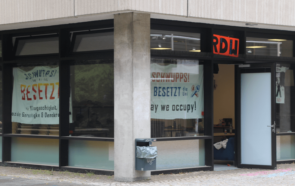 Der Raum des Widerstands (RDW) soll jetzt ein Schritt sein, mehr politisches Engagement an den Campus zu bringen. Schwupps! schreibt, der Raum 0079 stehe fortan allen politisch interessierten Menschen und auch Gruppen offen, die sich organisieren wollen. Etwa zum Plena abhalten, Materialien lagern, zum Transpi-Malen, oder auch einfach um sich während des Unialltags zu vernetzen.