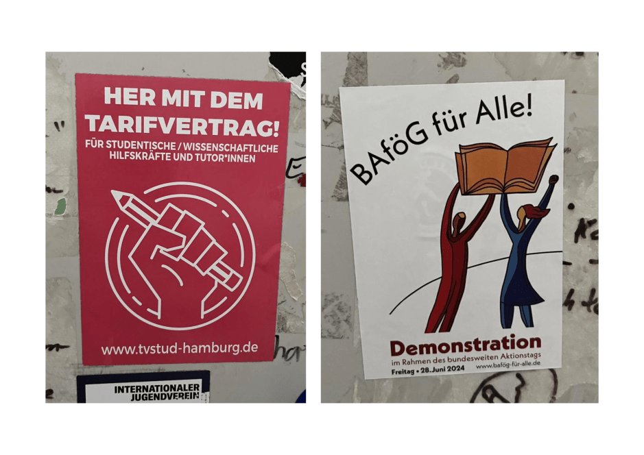 TVStud ist eine bundesweite Initiative, die schon seit Jahren für die Verbesserung der Arbeitsbedingungen von studentischen Hilfskräften, Assitent:innen und Tutor:innen kämpft. Das Ziel der BAföG-für-Alle Kampagne erklärt sich von selbst. An der UHH sind selbst in Zeiten von Social Media Sticker immer noch das Mittel der Wahl, wenn es um die Kommunikation wichtiger Botschaften geht. Es würde kaum überraschen, wenn die Projekte der beiden Gruppen durch die Toilettenlektüre einiges an Zulauf erhalten hätten.